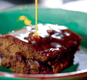 While the pudding is still hot, poke holes over the surface and pour over half the sauce. Set the rest of the sauce aside. Leave to stand for a while – the pudding can be left for a couple of days and will just get stickier. Serve warmed through again with the rest of the sauce, also warmed through.