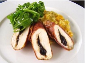 Open out chicken, season and arrange the prunes down the centre. Close pocket and wrap in slices of Parma ham. Oil and put on lightly oiled baking tray.