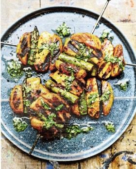 Gently turn the potatoes, asparagus, and halloumi slices in the harissa paste until evenly coated. Thread onto skewers.