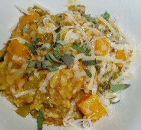 Reduce heat, add leeks and sage. Cook until leeks are softened but not coloured, and pumpkin soft but holds shape.