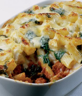 Tip half the pasta into a shallow (4 pint) ovenproof dish. Spoon over the sausage sauce, then the remaining pasta. Top with white sauce and cheddar.