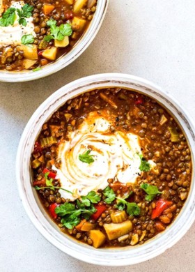 Hearty, rich and full of good stuff. Really easy to cook, and freezes well. Also works with green lentils (reduce water to 750ml). Just use vegan creme fraiche for a vegan version.