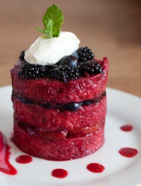 Hull and slice the strawberries into rounds. Halve the blackberries and blueberries.