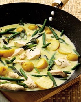 Tip in the potatoes, beans and and lime zest, and let them warm through. Remove from the heat, and stir in the basil leaves just before serving (they will quickly lose their brightness). Scatter with the lime garnish and serve immediately with boiled rice.